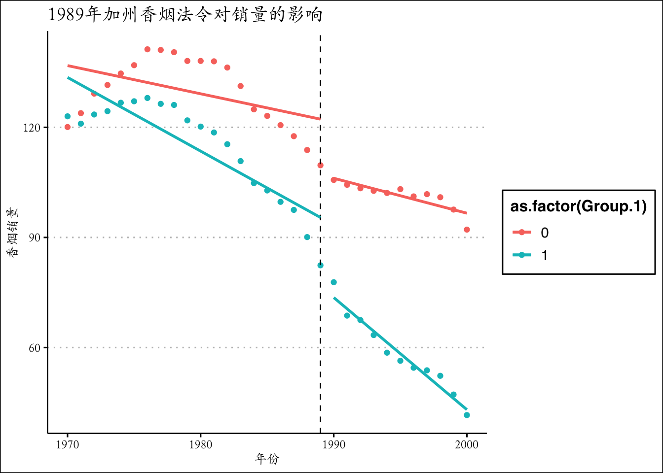 ggtitle('1989年加州香烟法令对销量的影响') + xlab('年份') + ylab("香烟销量")+