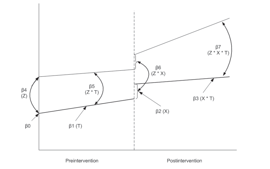 - 是一个虚拟变量去衡量政策干预(intervention)(干预之前为0,干预之后为1)